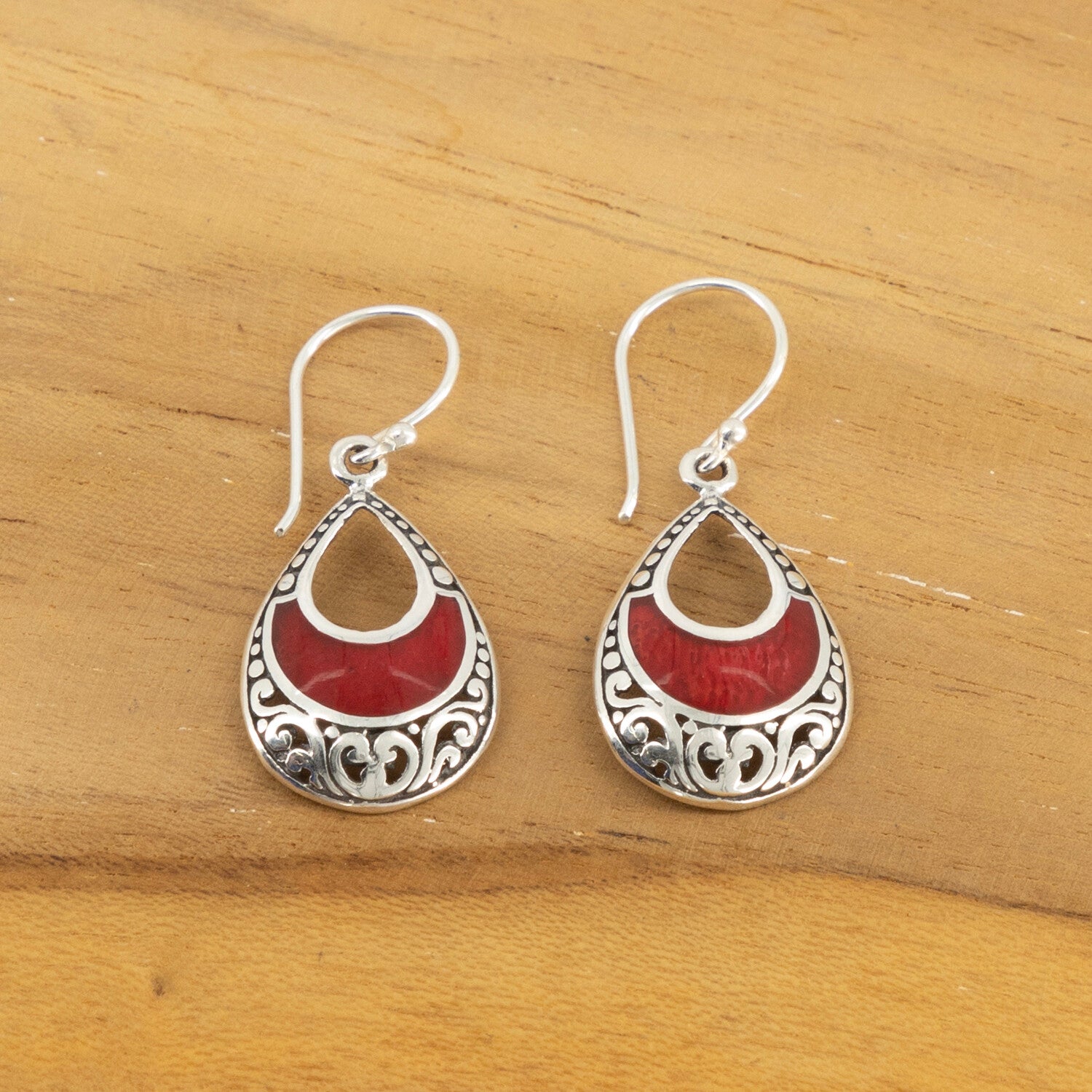 Prachtige oorbellen van massief zilver en een dieprode inleg van koraalmotief. Lengte: 2 cm. Breedte: 1.5 cm.