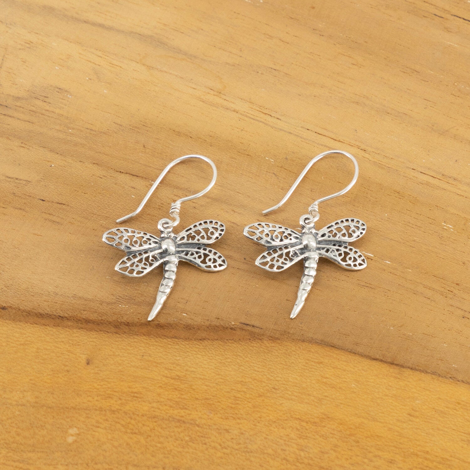 Prachtige oorbellen van zilveren libelles. Het hangertje uiteraard ook van massief zilver 925. Afmetingen: 2 bij 2 cm.