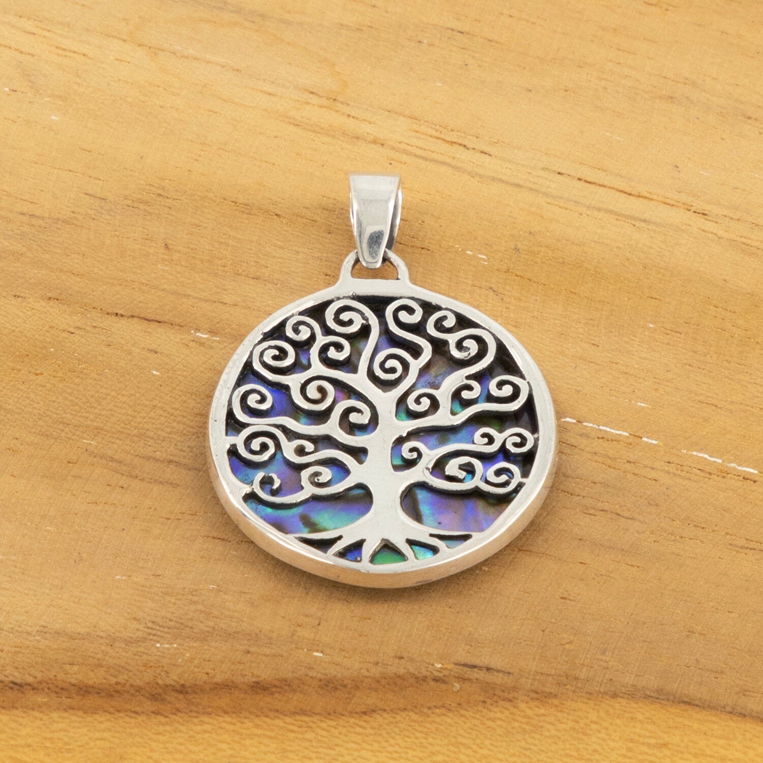 Mooie zilveren levensboom hanger met paua schelp ondergrond. Breed: 2.5 cm.
