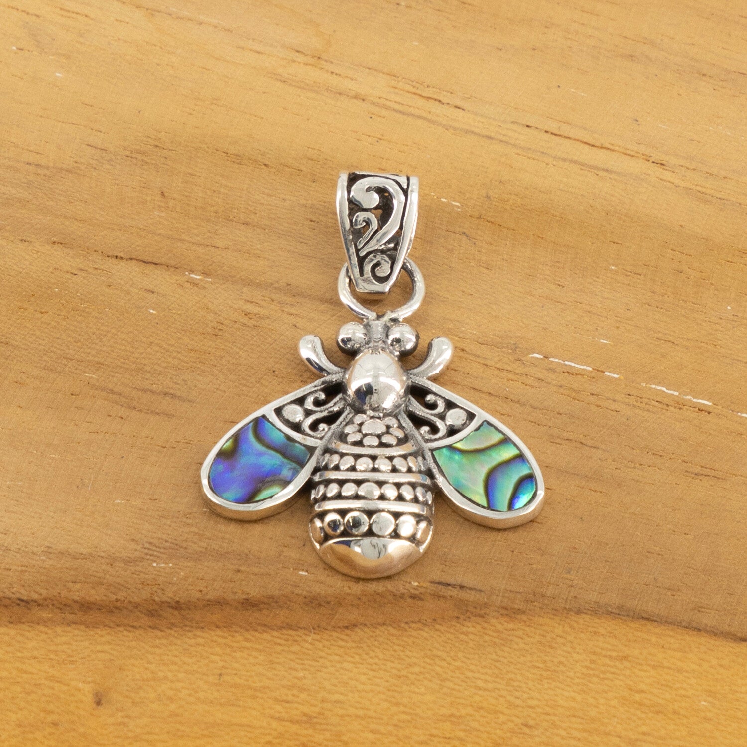 Prachtig hangertje in de vorm van een bij. Massief zilver met in de vleugels abelone gezet of paua schelp. Afmetingen: 2.5 cm bij 2.5 cm.