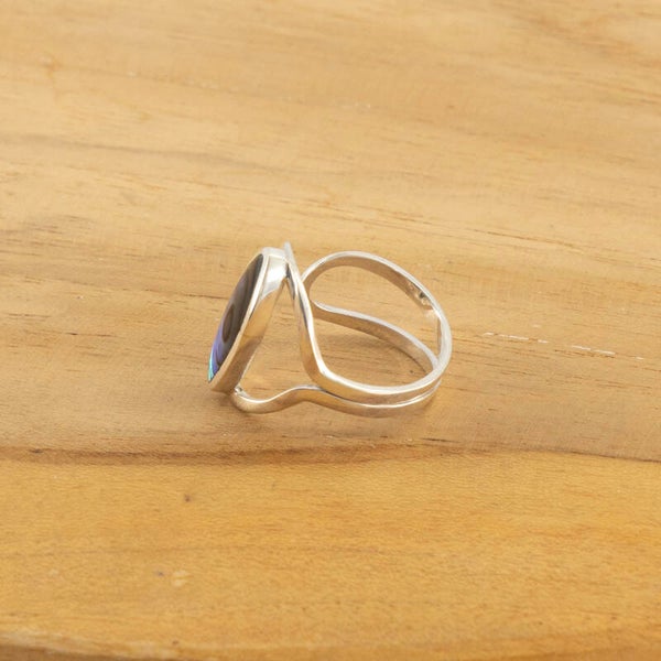 Mooie zilveren ring met een ovaal paua schelpje van 1.8 cm lang. Deze ring is iets verstelbaar en in 3 maten leverbaar.