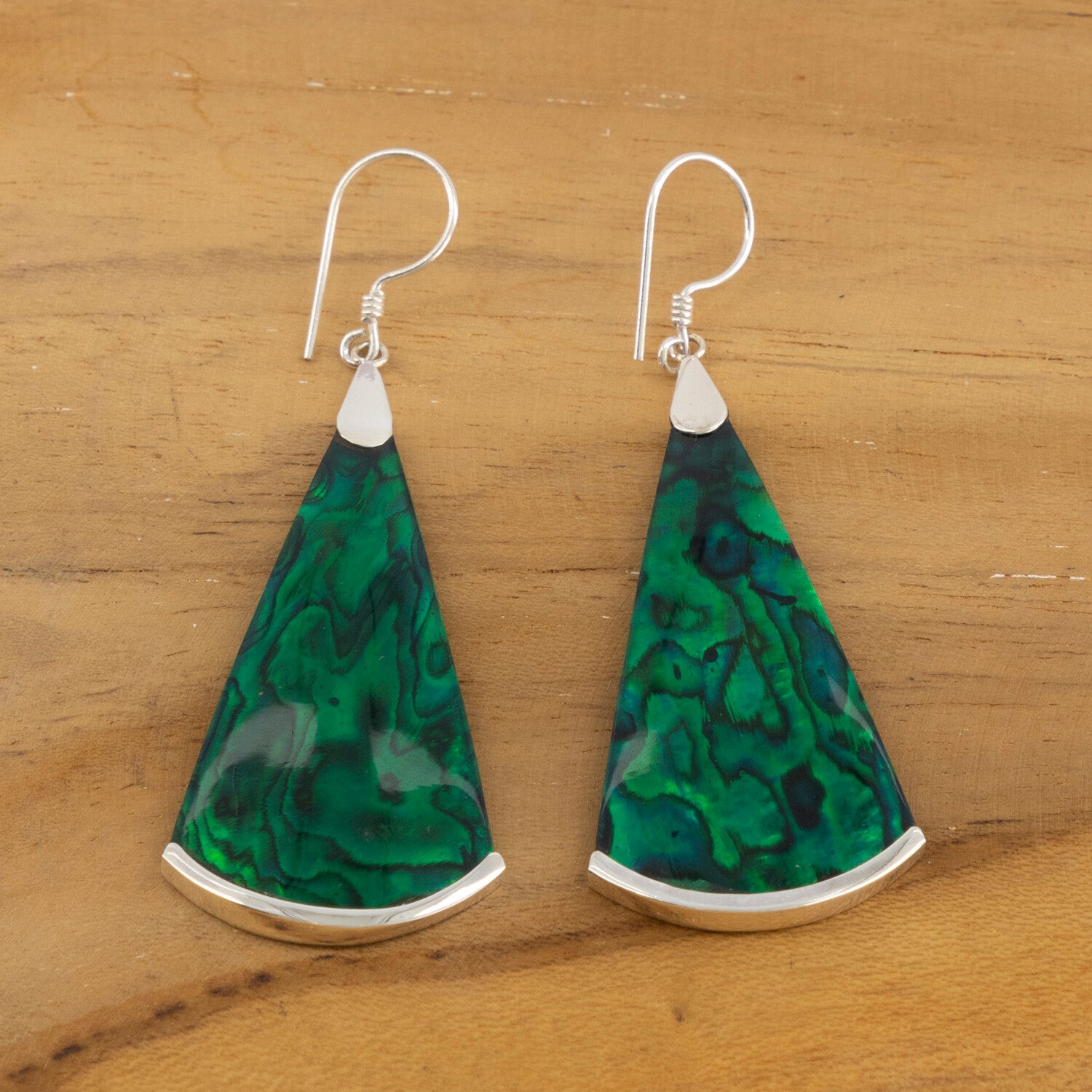 5 cm lange oorhangers van paua schelp met groene hars en 925 zilver.