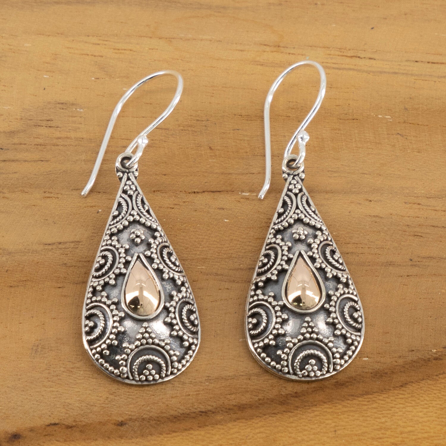 Prachtig oosters bewerkte oorhangers in druppelvorm. Massief 925 zilver met goud gevuld druppeltje in het midden. Afmeting: 3 bij 1 cm. Gewicht: 2.4 gram per oorbel.