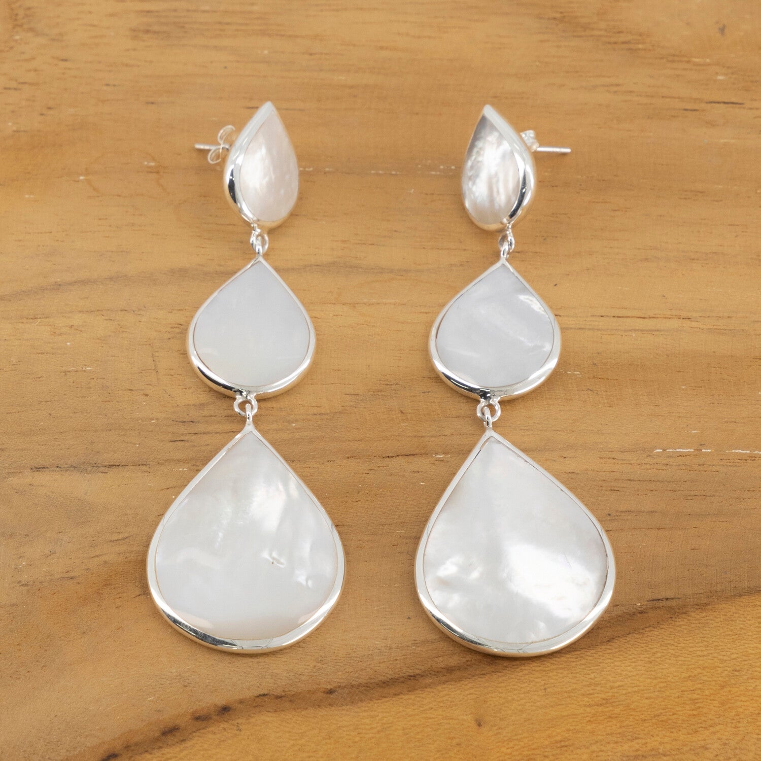Zeer fraaie 925 zilveren oorstekers met inleg van parelmoer. Lengte: 7 cm. Breedte onderste element: 2 cm. Gewicht 1 oorbel: 6.5 gram.