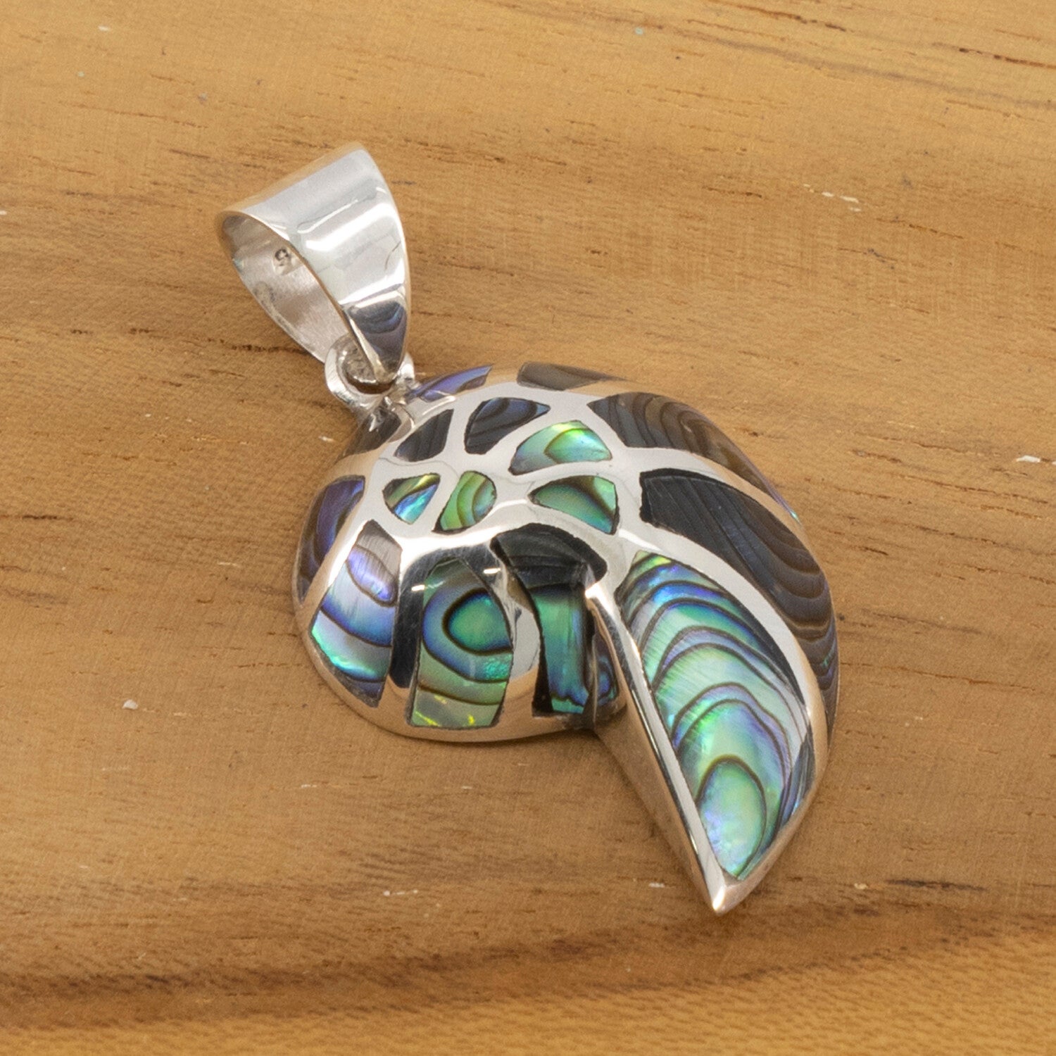 Prachtig massief zilveren hangertje met paua schelp inleg. In de vorm van de nautilusschelp. Gewicht: 5 gram. Afmetinge: 3 bij 2 cm.
