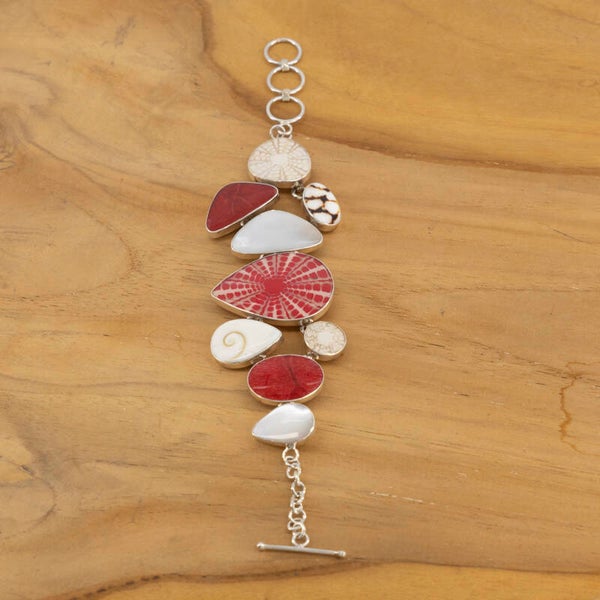 Fraaie zilveren armband opgevuld met delen schelp en rode hars. Breed: 3.5 cm. Deze armbanden zij geschikt voor polsmaat 16 t/m 19. Verlengen kan tegen meerprijs en langere levertijd.