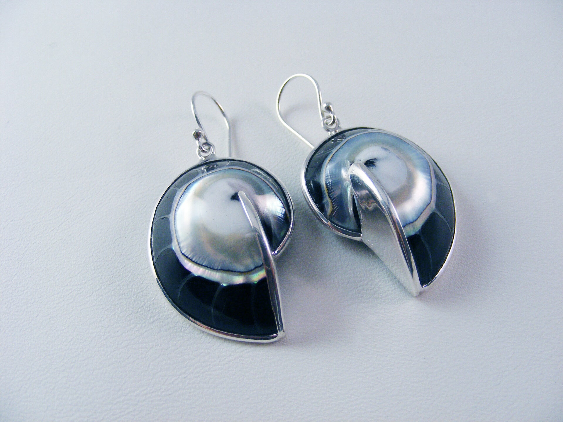Zwarte Nautilus Oorhangers in massief zilveren omlijsting.