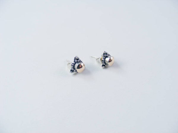 Massief 925 zilveren oorstekers in driehoek vorm met verguld (14K) rondje in het midden. Doorsnede: 0.8 cm.