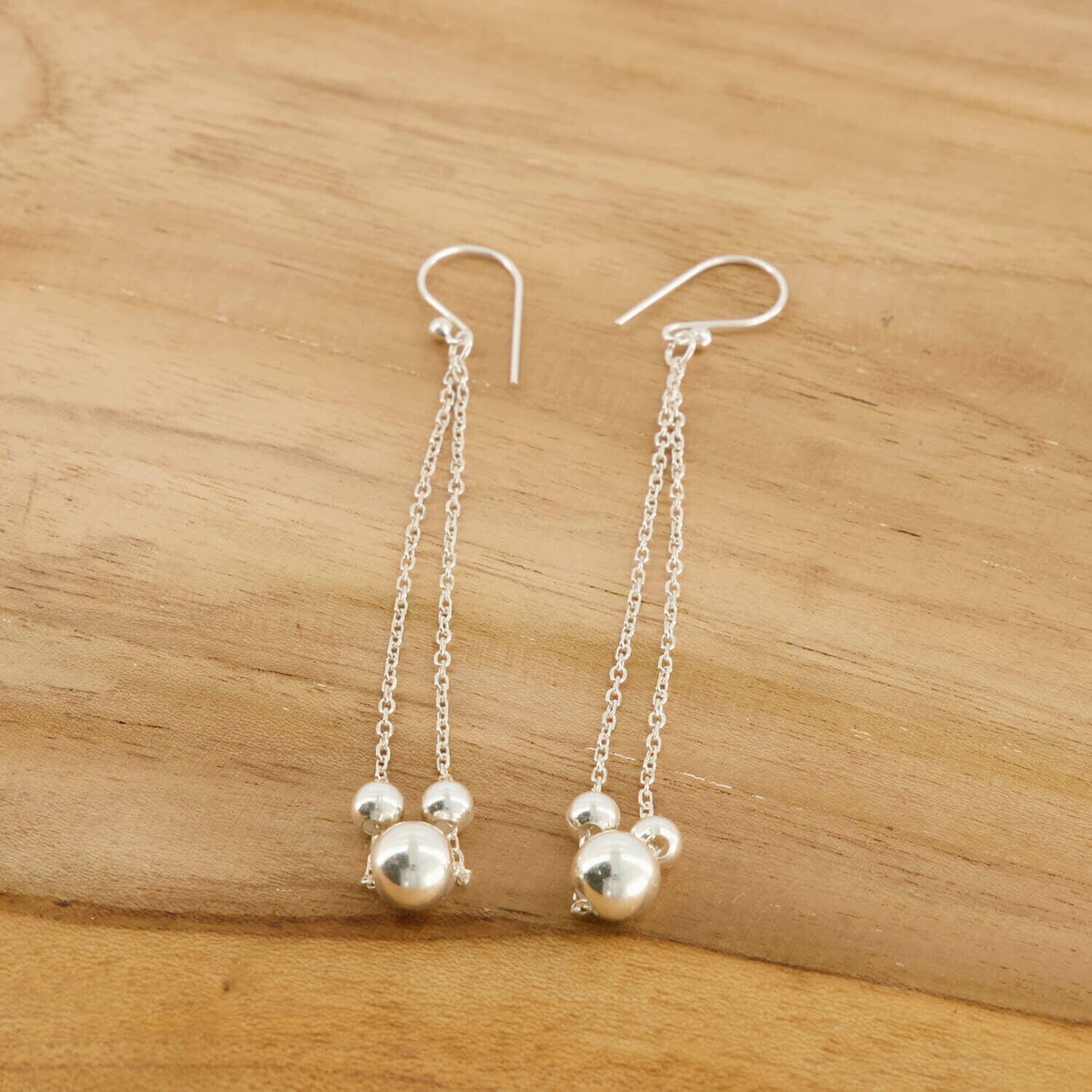 Sierlijke hangoorbellen van 925 zilver. 3 bolletjes aan 2 kettinkjes. Lengte: 7 cm !!