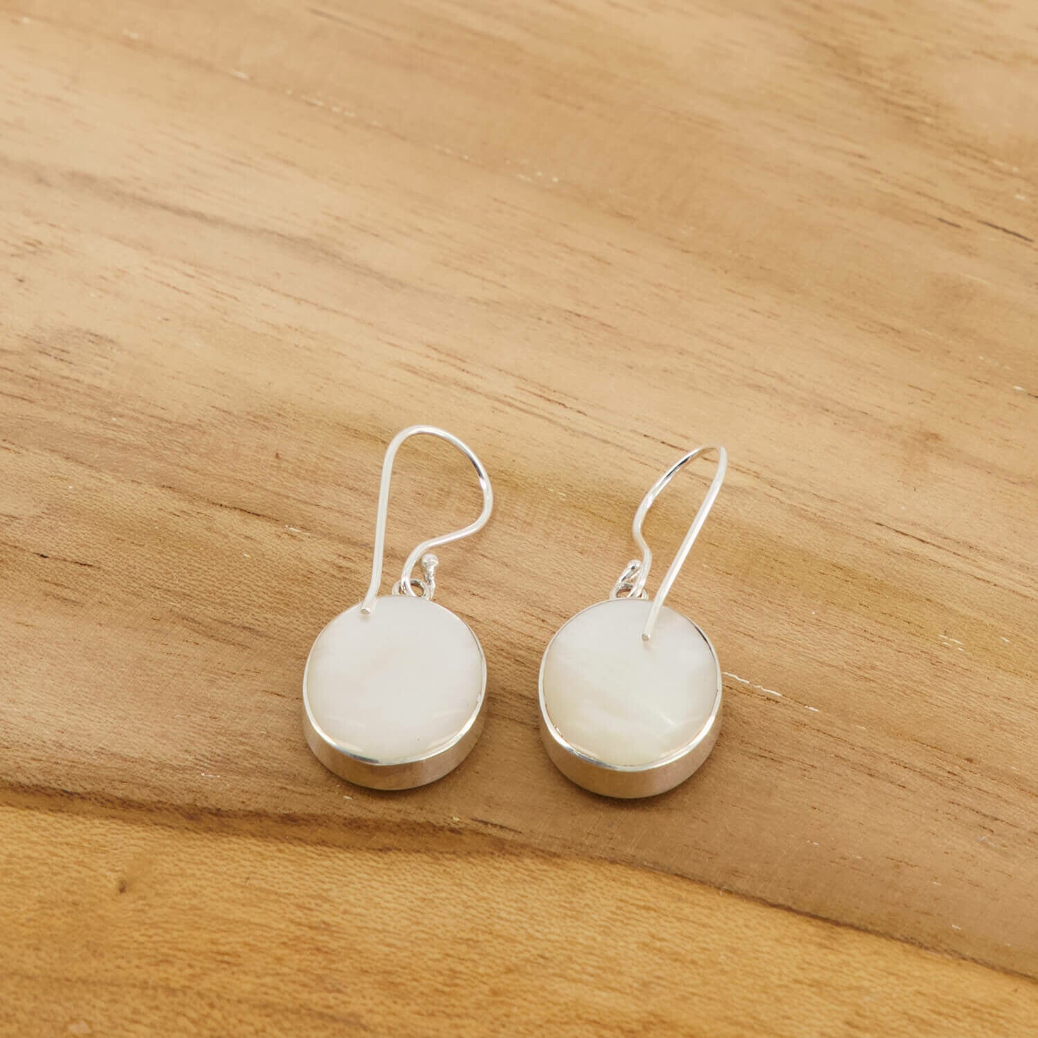 Massief zilveren hangoorbellen, met parelmoer en rood koraal "look" inleg. Kleur te wisselen door het haakje om te draaien. Lengte: 17 mm (excl. hangertje).