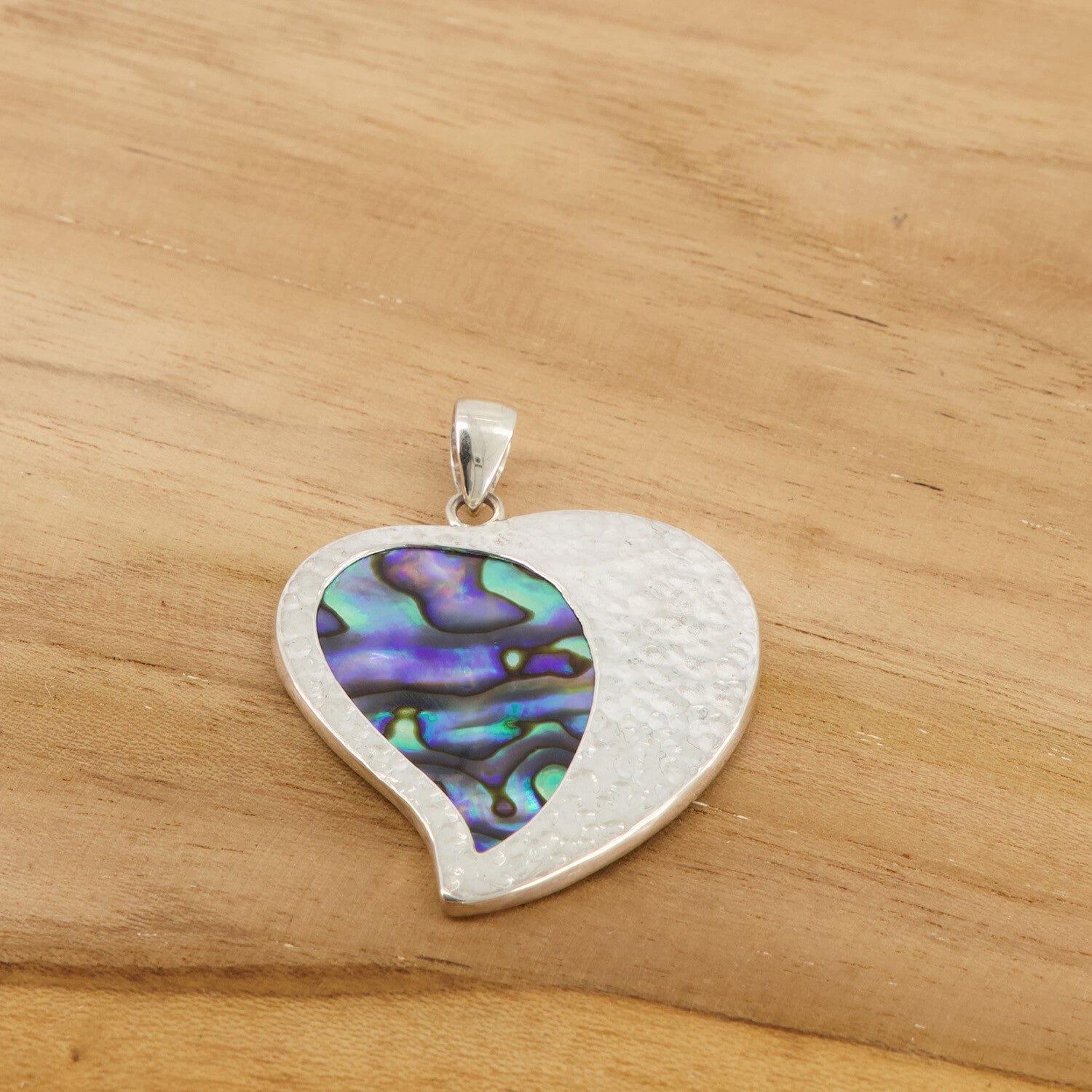 Massief zilveren hanger met paua schelp inleg. Het zilver is gehamerd. Lengte: 4 cm. Breedte: 3.5 cm. Gewicht: 9 gram.