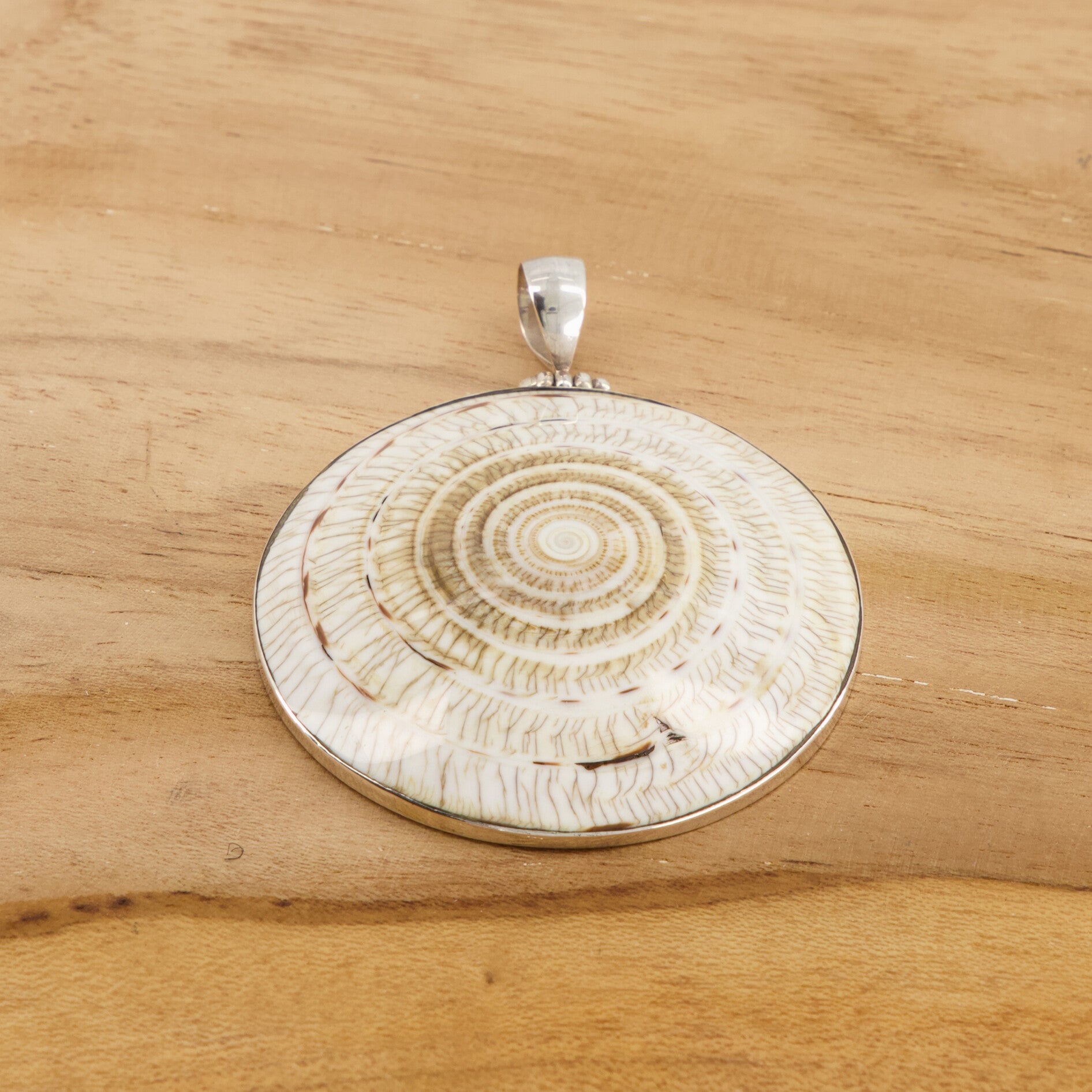 Bol lopende schelp met prachtige natuurlijke opbouw. 5 cm doorsnede. Massief zilveren omlijsting.