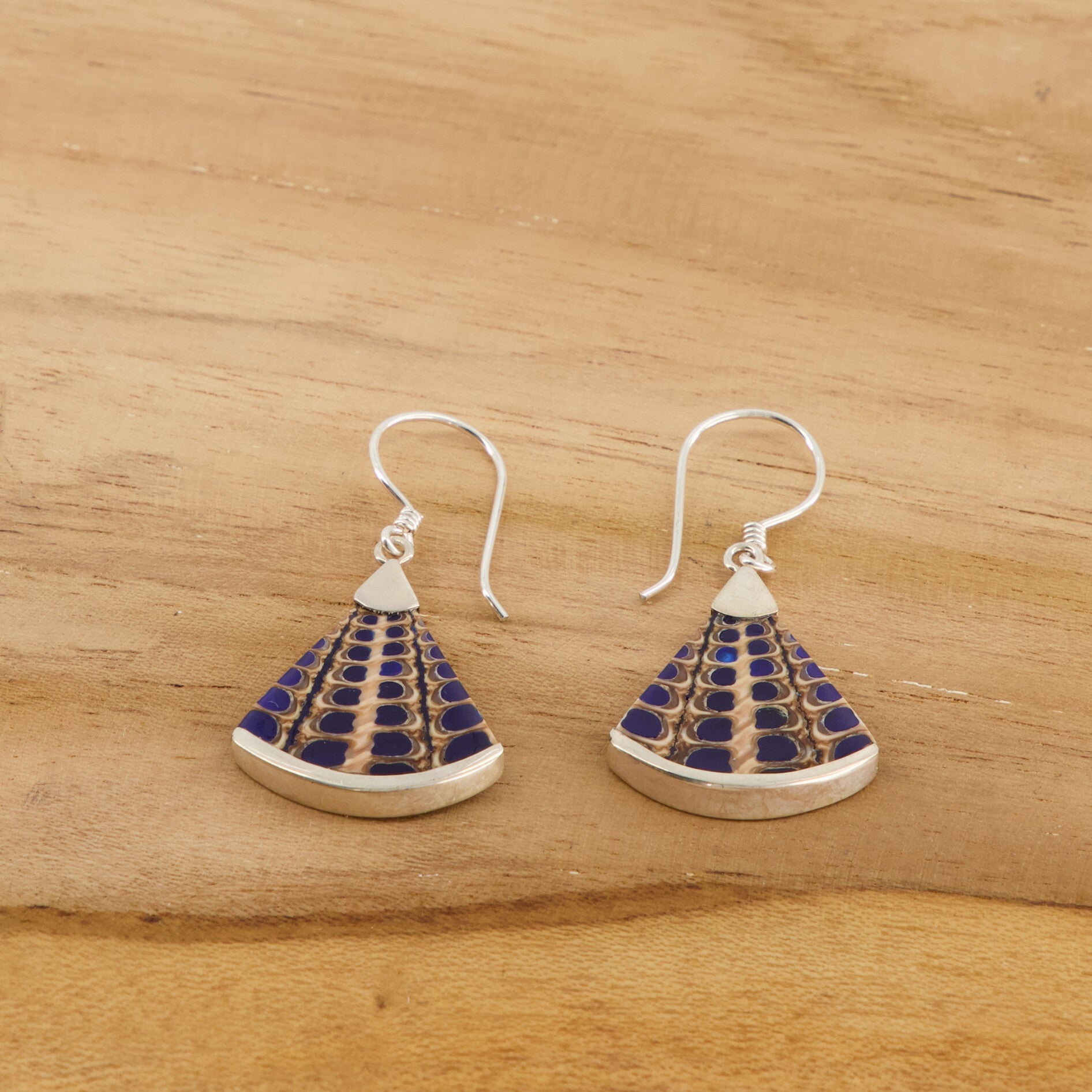 Deze waaiertjes gemaakt van schelpen die zijn opgevuld met een blauwe kunsthars en massief zilveren omlijsting. Lengte: 2 cm(excl. haakje). Breedte: 2 cm. Gewicht: 4 gram (set).