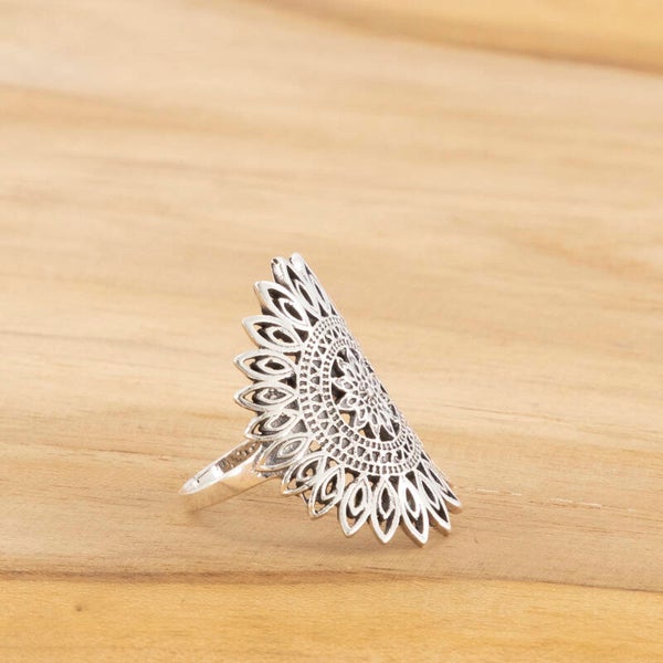 Massief zilveren ring die mooi vlak om de vinger valt. Lengte: 3 cm. Origineel patroon.