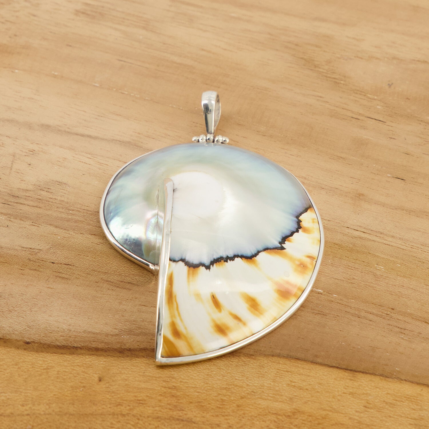 Natuurlijke nautilus hanger met zilveren omlijsting.
