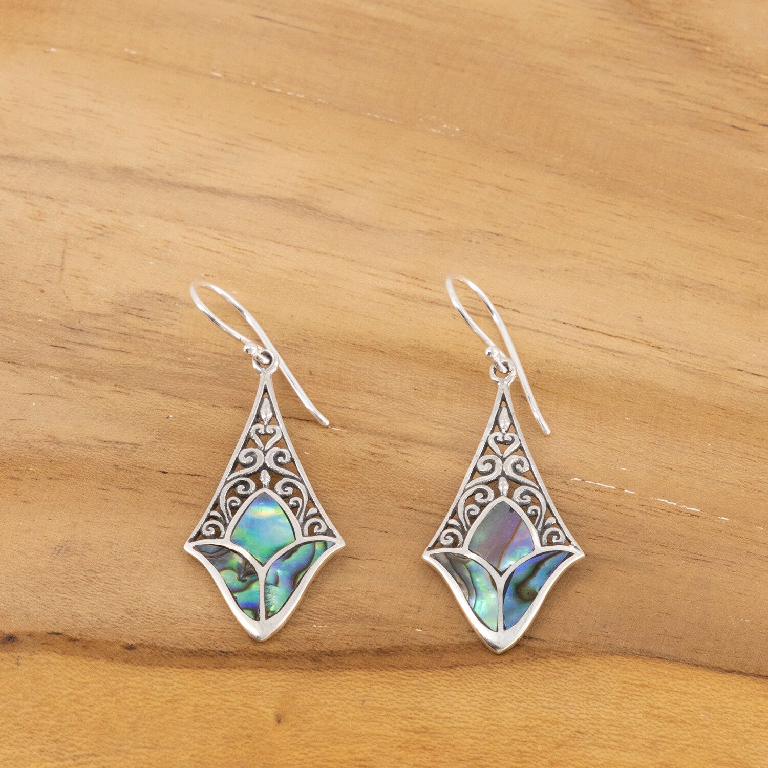 Mooie zilveren hangoorbellen met paua inleg in ruit vorm. Lengte: 3.5 cm. Breed: 1.7 cm. Handgemaakt in Indonesie.