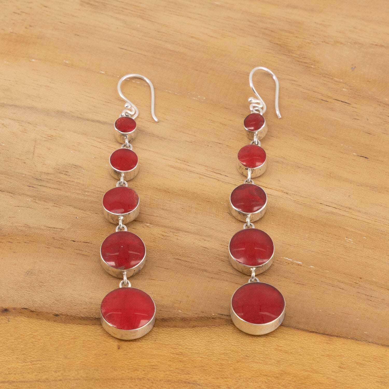 Zeer originele oorhangers van massief zilver. Inleg van parelmoer aan een kant en diep rode hars aan de andere kant. Van kant te wisselen door het haakje om te draaien. Lengte: 7 cm, zonder het hangertje.